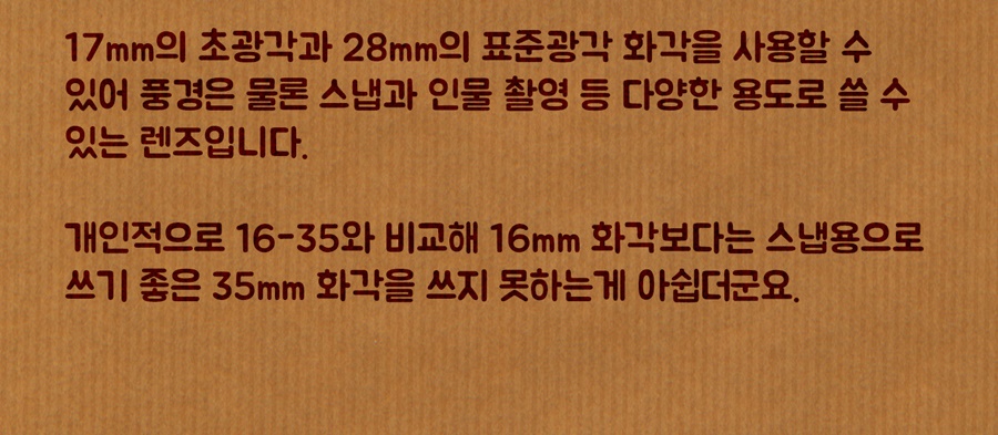17mm�� 28mm ȭ���� F2.8�� ���� �������� ���鼭 ȭ���� ���� ���ϱ�� ���� �������� �̳� �� ����� ���� ������ �÷��� ȭ���� �ٲ㵵 ���� �߽��� �ٽ� ���� �ʿ䰡 ���ٴ� ���� ���� ��� �����Դϴ�.