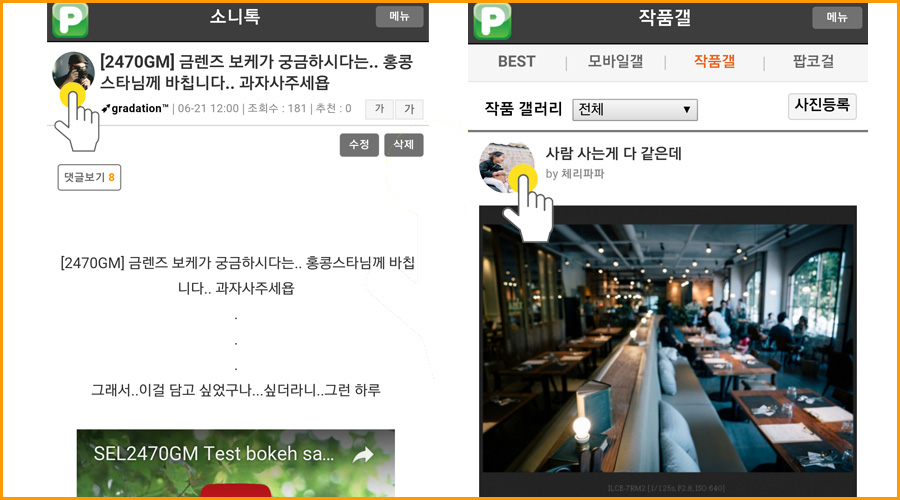 3. ����� ȭ���� ��� �Խù� Viewȭ�� ������ ���� �Ǵ� �г���  �׸��� �������� ����� ������ ������ Ŭ���ϸ�