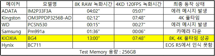 ������ �Z�� pm991a 256GB�� 8K RAW �Կ��� ���� ������ pm991a 512GB�� KIOXIA BG4 512GB ���� ���� ����� ��������ϴ�.