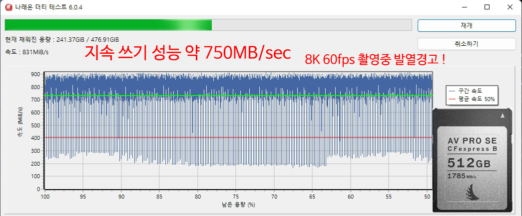 ������ ���� ij�� EOS R5 8K RAW 30fps�� ��� �� 325MB/sec ������ ������ �ʿ�� �ϸ�, ���� Z9 8K 60fps�� ���� �� 730MB/sec�� ���� ���� ������ �ʿ��� �մϴ�.