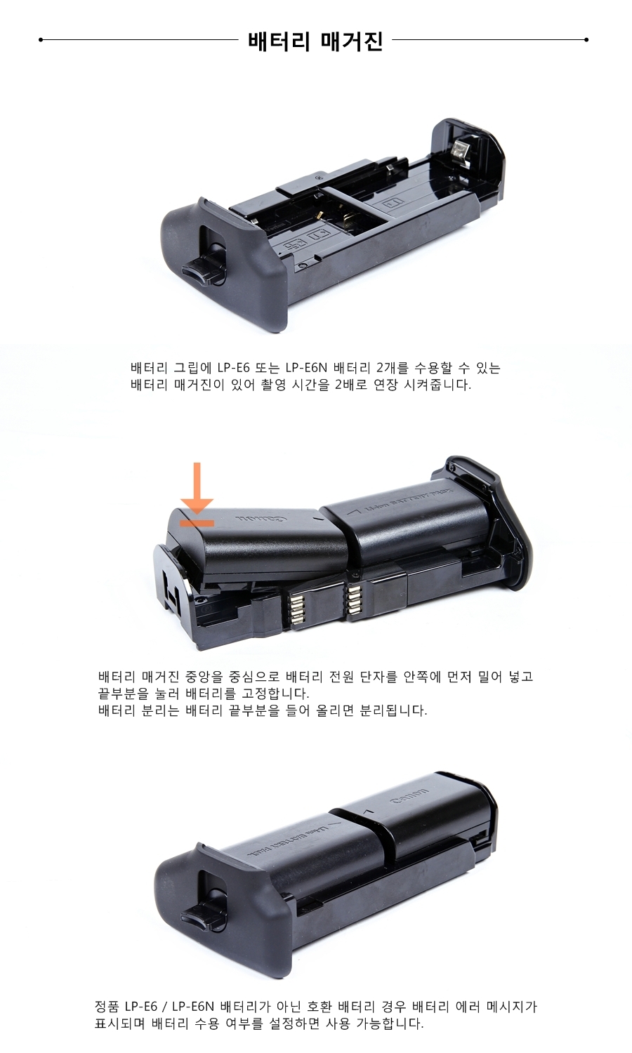 ���� ���� LP-E6 �Ǵ� LP-E6N ���� 2���� ������ �� �ִ� ���� �Ű����� �־� �Կ� �ð��� 2��� ���� �����ݴϴ�.
