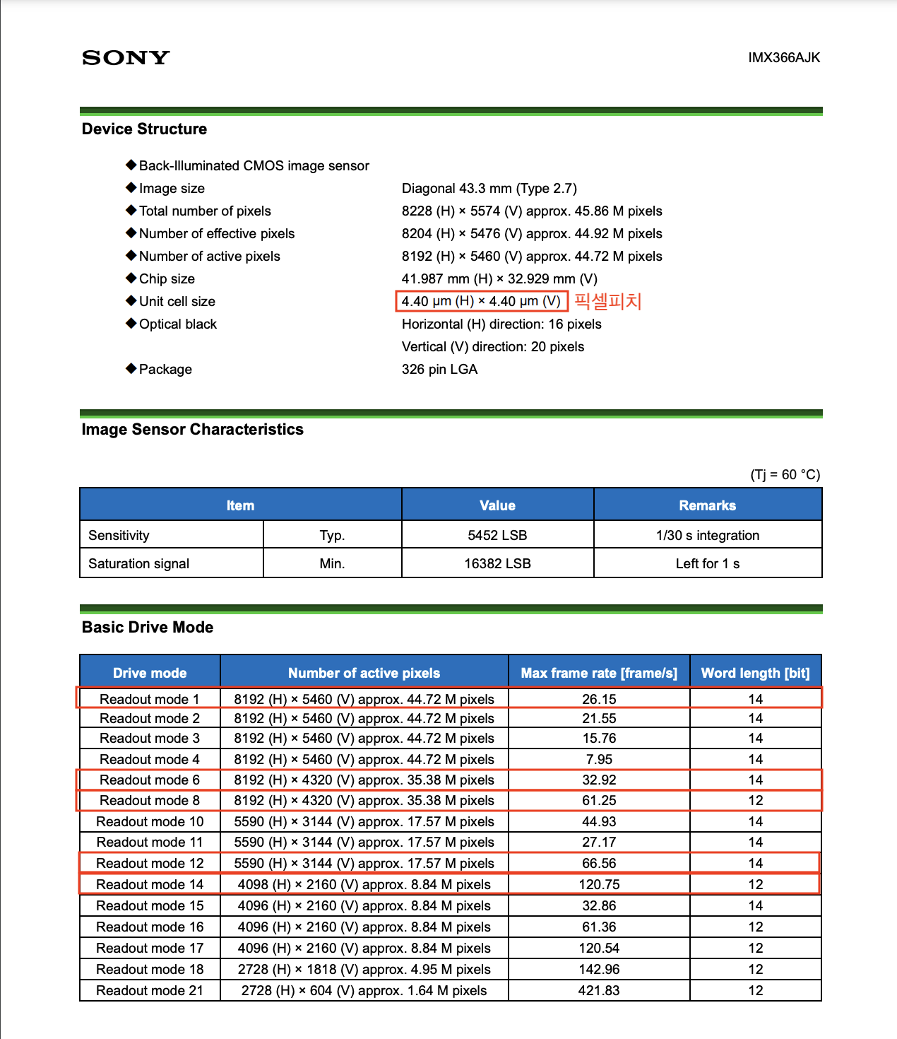 Readout mode 0�� ��ȭ���о���� �ִ뼺���Դϴ�. 14bit�� 26.16�������� �ִ뼺���Դϴ�. ���°���Ʈ 8K/24p�� �����մϴ�.