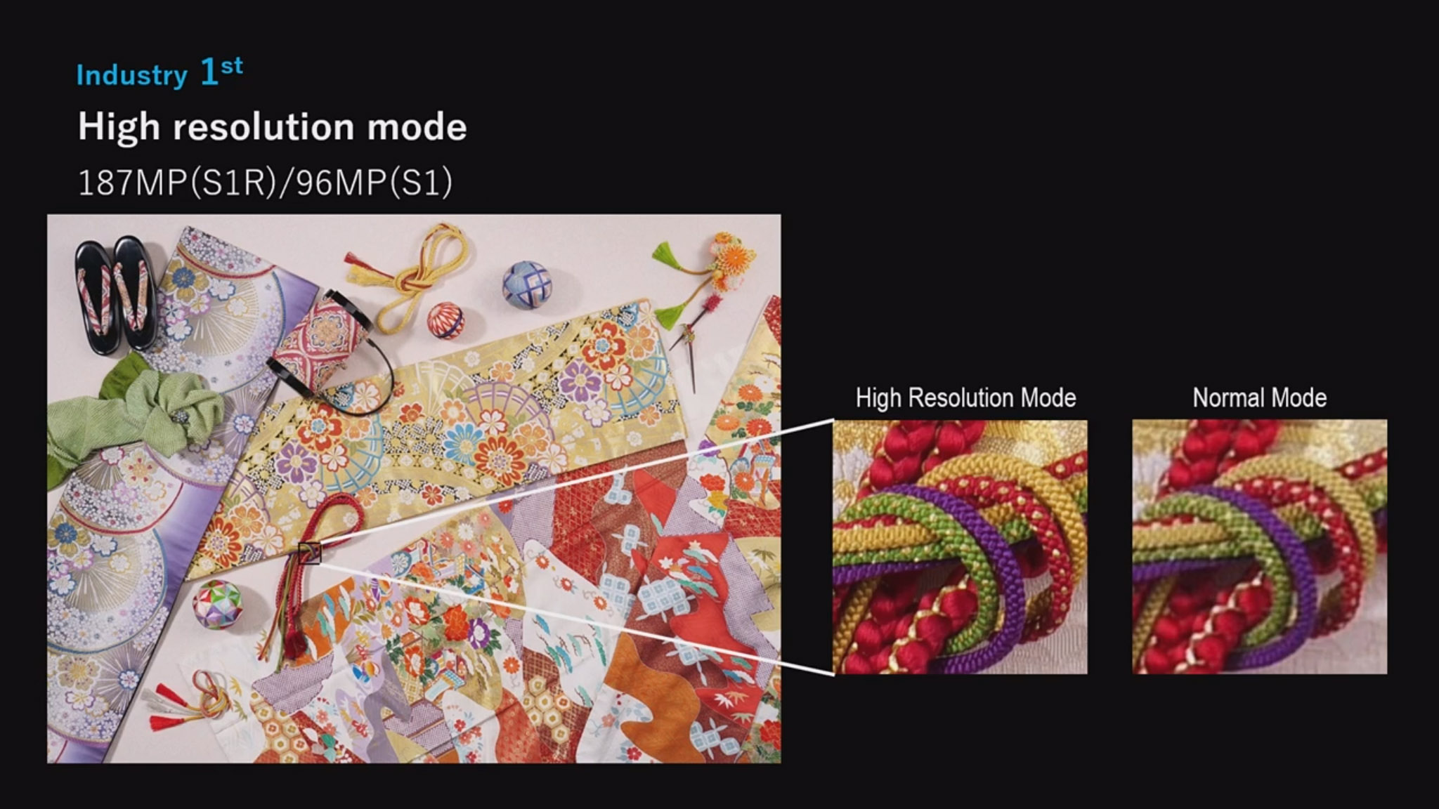 RAW �̹����� ������ �� �ִ� ���ػ� ��嵵 ����. Body IS (Image Stabilizer) ��Ŀ������ ����Ͽ� ������ �̵��ϸ� 8���� ���� �̹����� �ڵ����� �Կ�, S1R�� ���� 187 �ް� �ȼ� ��� (16,736 x 11,168 �ȼ�), S1�� 9600 �� ȭ�� (12,000 x 8,000 �ȼ�) �̹����� �����Ѵ�. ���ػ� ������ �ﰢ�븦 ����Ͽ� ������ �ǻ�ü�� ���� �������� �Կ��� �� �̻���������, �����̴� �ǻ�ü�� ��鿡 ���ԵǴ� ��Ȳ������ ����� �� �ִٰ� �Ѵ�.