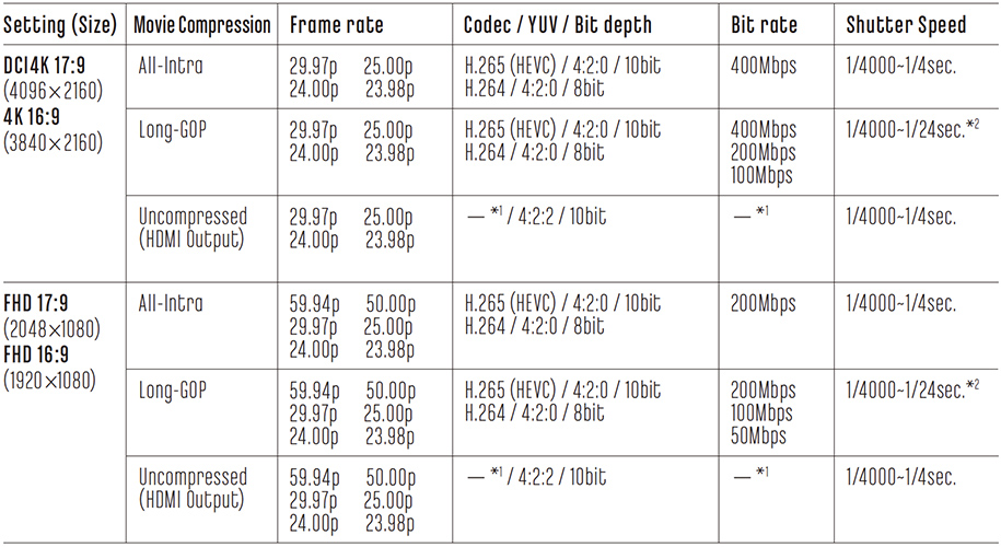 ������ ����� �ִ� DCI4K (4,096 × 2,160)�� ����. HDMI �ܺ� ��� �� Ǯ HD �� ���� ��ϵ� ����. HLG F-Log �� �����Ѵ�.