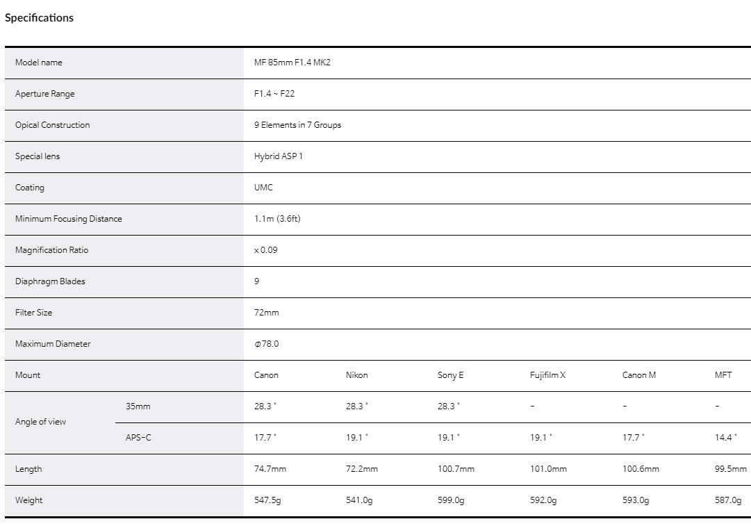 ����� Ǯ������ ������ �ظ��� �ܷ��� MF 85mm F1.4 MK2�� ���Ӱ� ��ǥ�ߴ�. MF 85mm F1.4 MK2�� ������ Ŭ�� ����(De-click) ��ɰ� �����Ǹ� �� ���ο� ��Ŀ���� �������� ä��������, Ư���� �ձ۰� �Ƹ��ٿ� ���ɿ� �Ǹ��� �̹��� ����Ƽ�� �����ߴٰ� �ϸ� �ϻ��� ��Ʈ����Ʈ ������ ���� ������ ����ȭ�� ���ο� MF 85mm ����� �����ϰ� �ִ�.