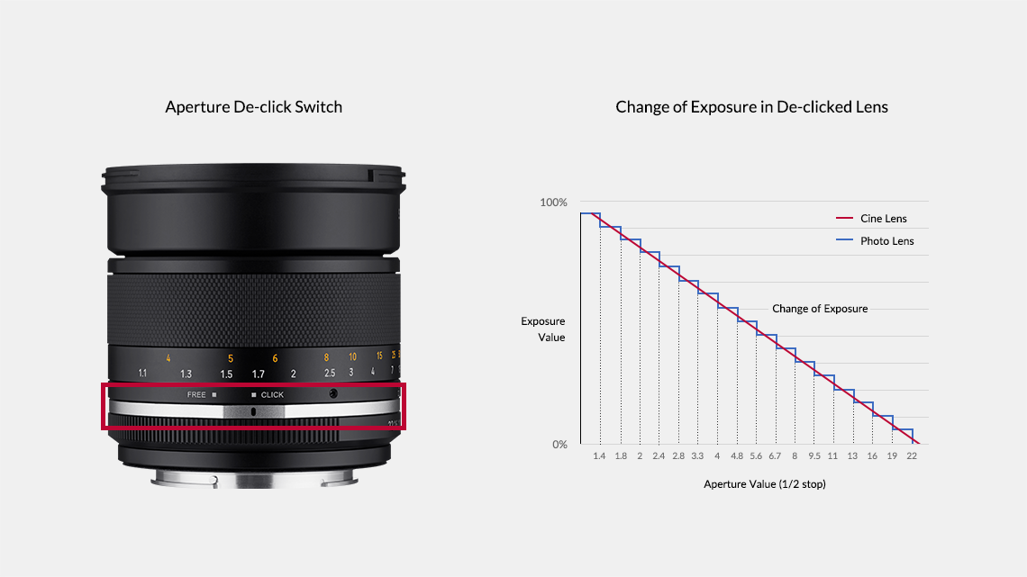 ������ ���� ���� "Click"���� "Free"�� �ű�� F-stop���� ���ߴ� �������� ���� �������� ����ȴ�. F-stop ������ 1/2 stop���� �̼��ϰ� ������ ���� ������ �� �־� ��� ��ȭ�� ���� ���� �ε巴�� ���������� ������ �Կ��� �� �ִ�.