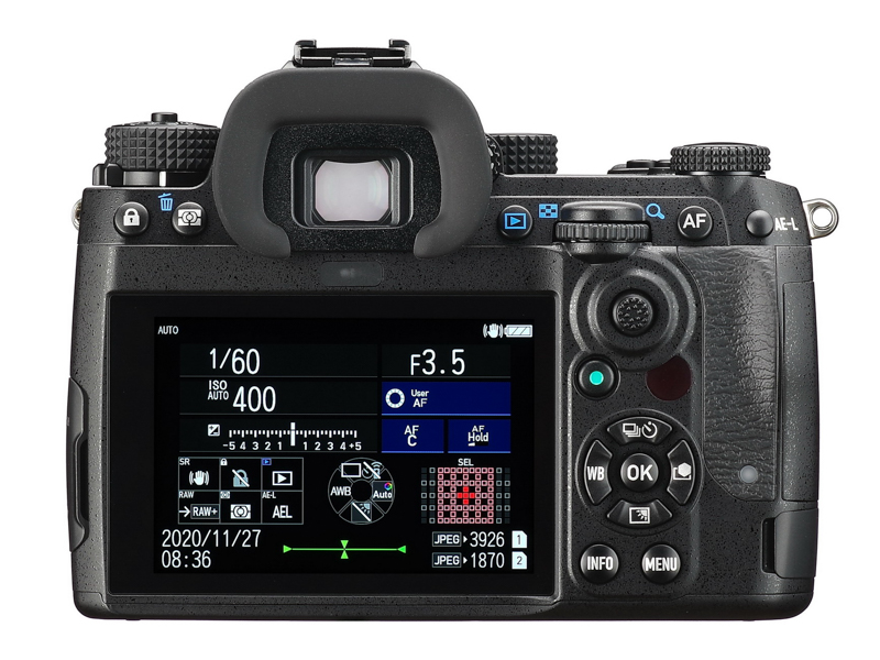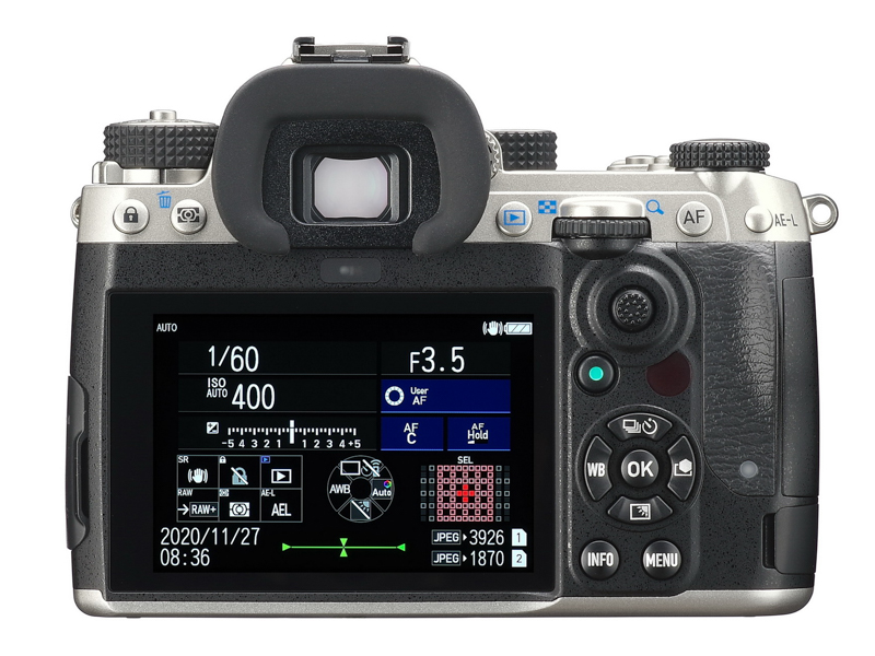 ���δ��� �þ��� �� 100 %, ���� �� 1.05 ��, ���� ������ Ȯ���� 35mm Ǯ����� �����ϴ� ū ������ �����ߴ�. ������ �� ���δ� ���÷��̸� ä���Ͽ� K-3 II ��� ��⸦ 10% ���. ��ũ���� MF ���Ǽ��� �پ ���� �����Ʈ ��Ʈ III�� ä��.